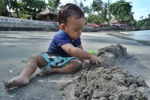 Tetapi kami terus memberi pengertian, agar dia menikmati indahnya pantai, kami menganjurkan untuk bermain di hamparan pasir pantai, dengan sedikit terpaksa diapun turun ke pasir bersama adiknya. Pada mulanya enggan untuk menggaruk pasir, kami melihat Wennata, adiknya mulai mempermainkan pasir dan membuat gundukan-gundukan entah apa, yang jelas Wennata lebih enjoy dibanding kakaknya.